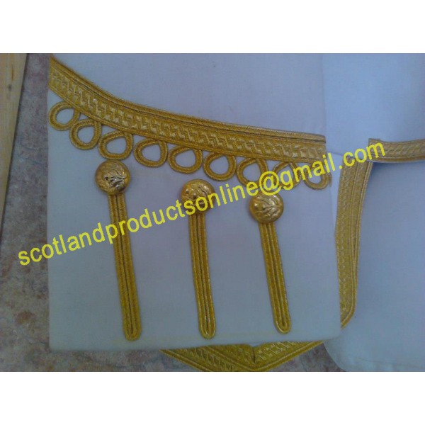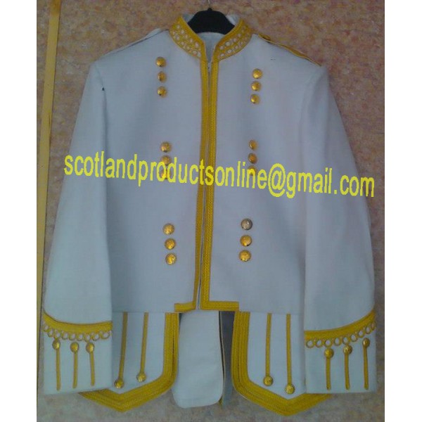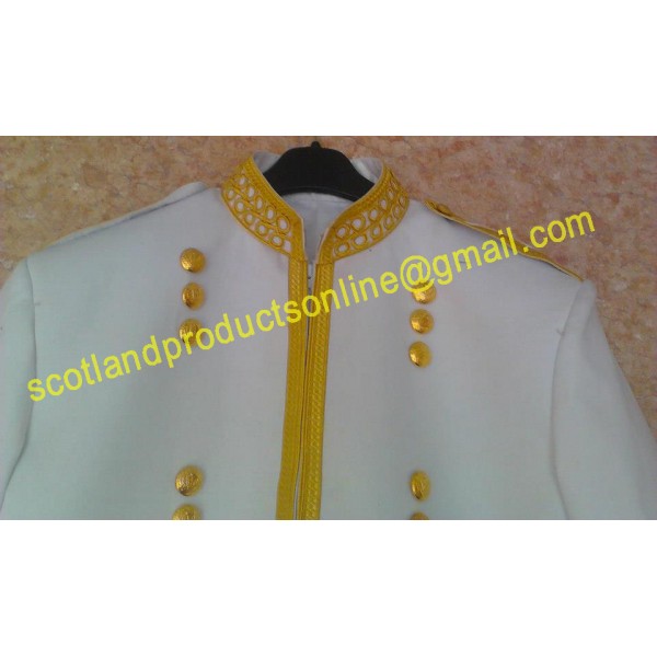 White Cotton Pipe Band Piper/Drummer Doublet Jacket, Gold trim, Gold braid with gold buttons.