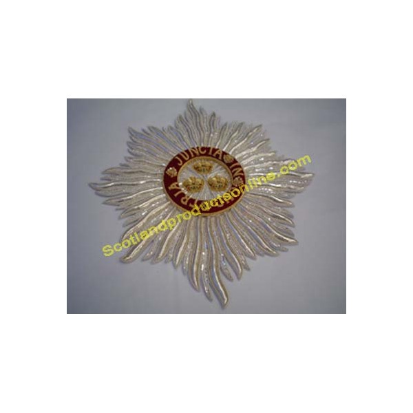 This delicate robe badge is professionally hand embroidered in 90% silver and 2wm gold and enhanced with coloured silks. It features a velvet garter with the inscription "Tria Juncta in Uno" which translates as "three join to become one". This motto was historically thought to refer either to the Union of England, Scotland and France, or to the Union of England, Scotland and Ireland, or to the Holy Trinity.