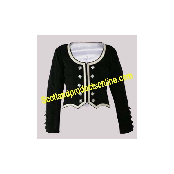 Black Highland Dancing Vest with seleeve made in good quality velvet fabric with silver braid and nickle plated thistle diamond shave buttons.