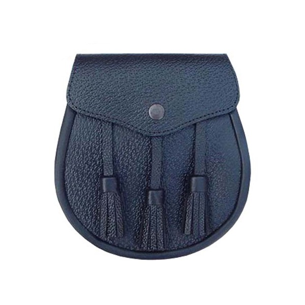 Leather black sporran three leather black tassels on the front with nickel plated chain leather black strap fitted nickel plated hardware buckle.