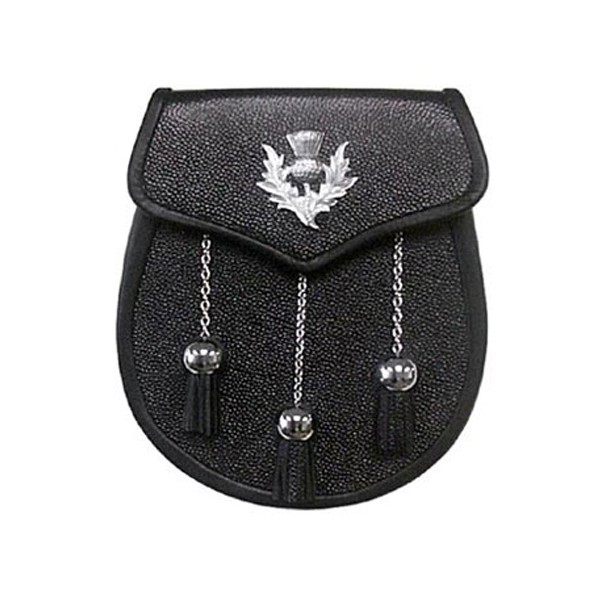 Leather black sporran three nickel plated chain attached leather black tassels and nickel plated thistle badge on the front with nickel plated chain leather black strap fitted nickel plated hardware buckle...