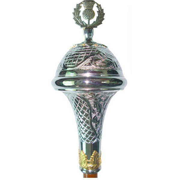 Drum major mace engraved head with thistle badge on crown, shape is a leafing pattern which extends upward approximately 1 1/4 inch.