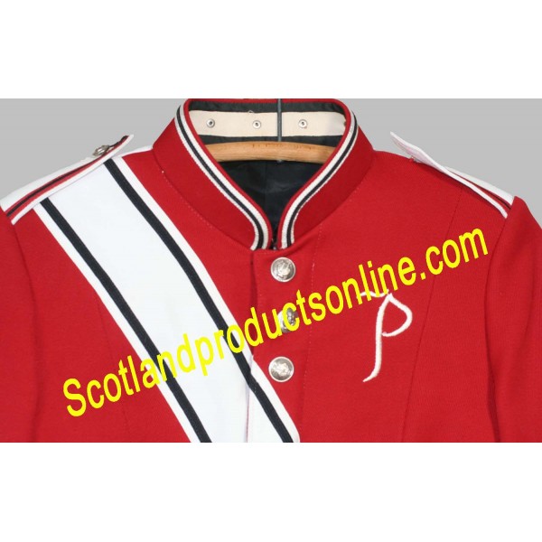 Vintage jacket for a band uniform. red with white and black trim. silver metal buttons. mandarin collar. short 'tail' in the back. there is an embroidered 'p' on the front left side. buttons and white cord embellishments at each cuff. shoulders are slightly padded. fully lined.