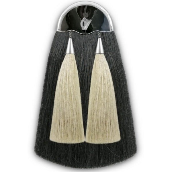 Military long horse hair sporran/pipe band long horse hair sporran made by black horse hair and off white horse hair tassels with nickel plated light cantle nickel plated harp badge and nickel plated tassels chain & bells...