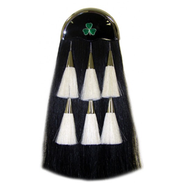 Military long horse hair sporran/pipe band long horse hair sporran made by black horse hair and white horse hair tassels with nickel plated light cantle nickel plated irish maple leaf badge and nickel plated tassels chain & bells...