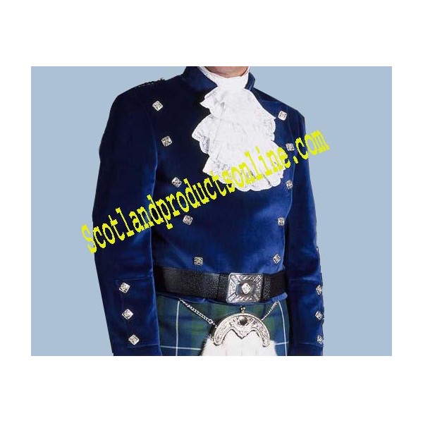 Montrose Doublet is a double breasted short cut evening jacket with high collar. There are ten symmetrically positioned thistle buttons on front, three thistle buttons on each cuff and epaulettes with thistle buttons on each shoulder.