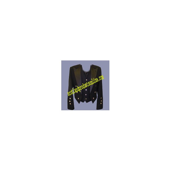 Black 100% Wool body, with black nylon / silk blend full lining, 6 front diamond thistle buttons, 6 cuff buttons, 6 back buttons, 2 buttons shoulder, with 5 buttons waist coat in wool.