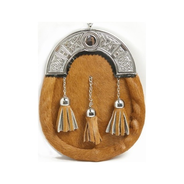 Real rabbit hair fur sporran brown fur on the front with nickel plated cantle three nickel plated chain and fur tassals with nickel plated chain leather black strap fitted nickel plated hardware buckle...
