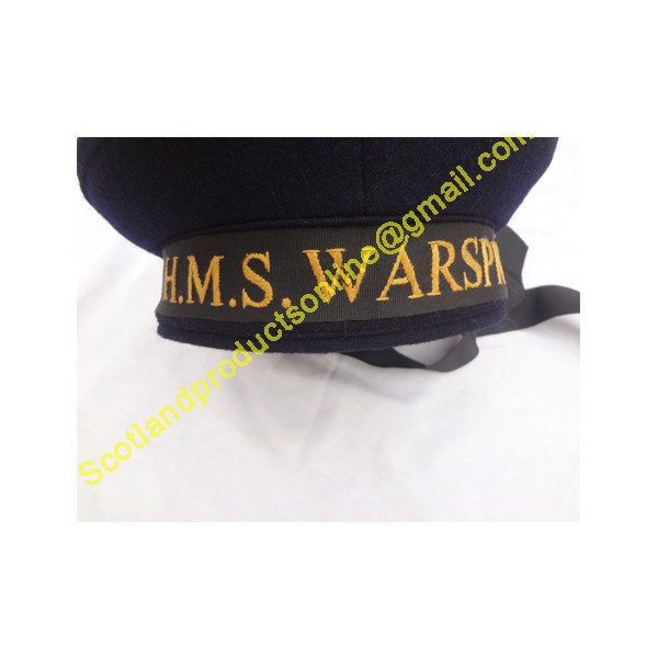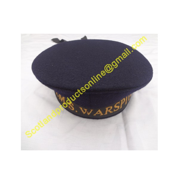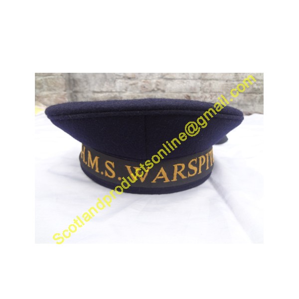 ROYAL NAVY sailor pork pie cap re-production, hat made in navy blue wool and cap tally legend is:H.M.S WARSPITE.