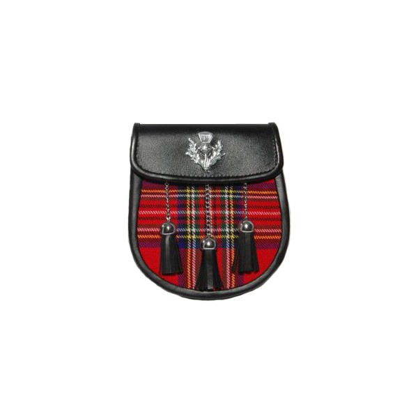 Sami dress sporran royal stewart tartan on the front with nickel plated thistle badge three nickel plated chain and tassels with nickel plated chain leather black strap fitted nickel plated hardware buckle...