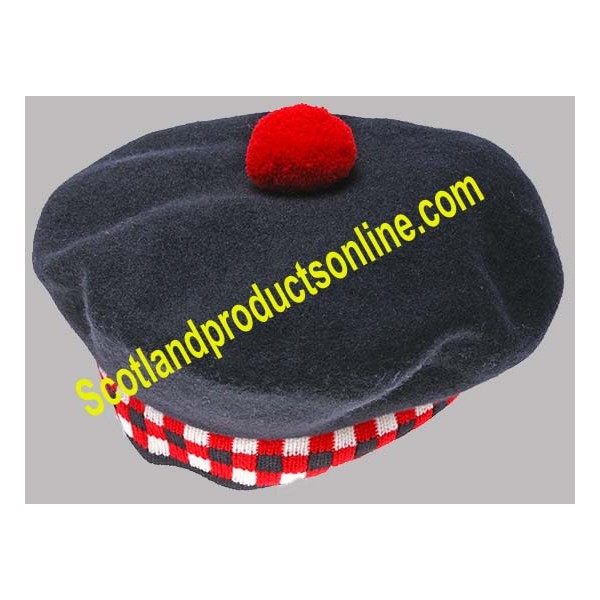 Balmoral Tam O'Shanter Classic Gun Blue/Red and white dicing made in good quality new wool. You can also wear with highland dancing dress.