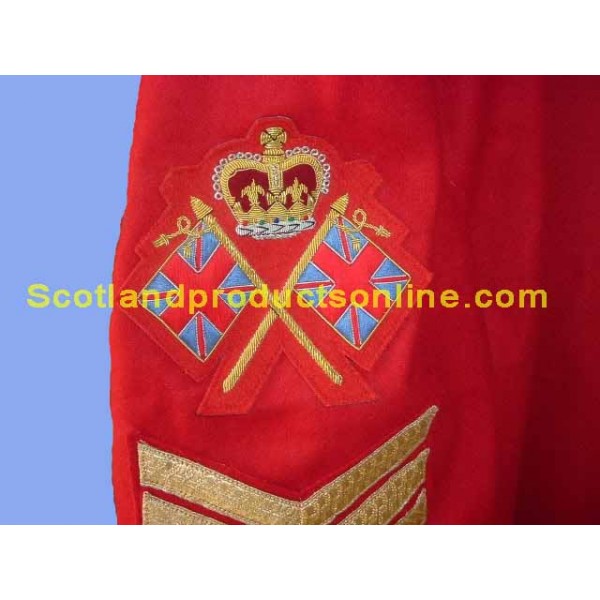 The 5 button tunic of the Zulu war uniform is made in red melton. The Zulu war uniform tunic has arm of service stripes and badge. The Zulu war uniform tunic is custom tailoring.